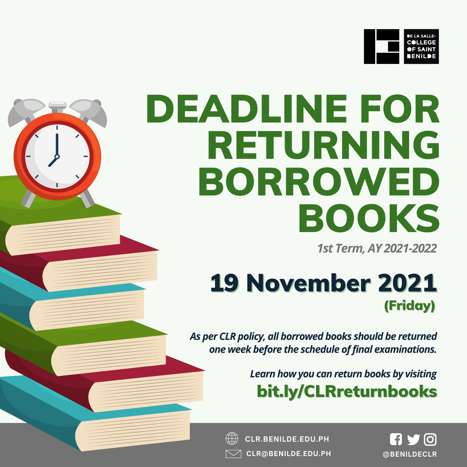 As per CLR policy, all borrowed books should be returned one (1) week before the schedule of final examinations so please be guided accordingly.
